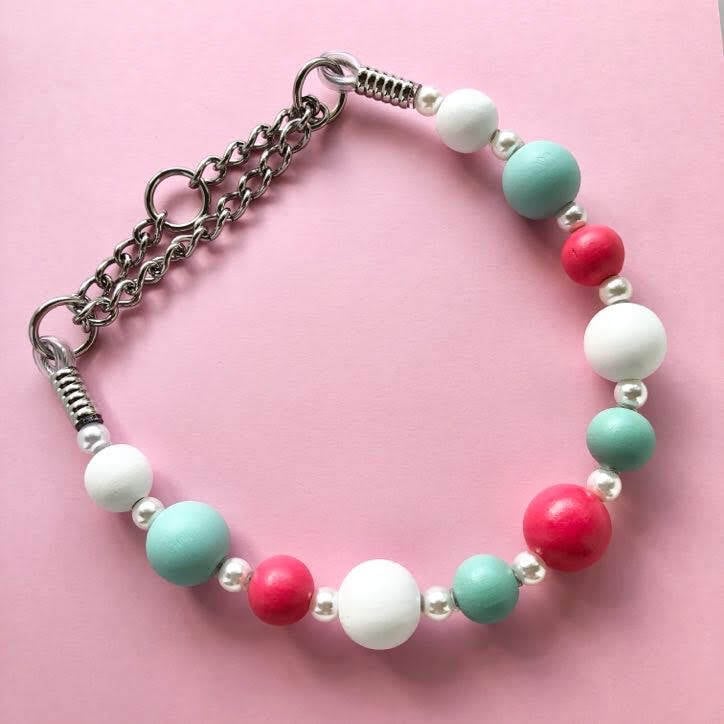 カラフルなラウンドウッドビーズ20㎜と30㎜を交互に使い間に8㎜アクリルパールビーズを使用しています。