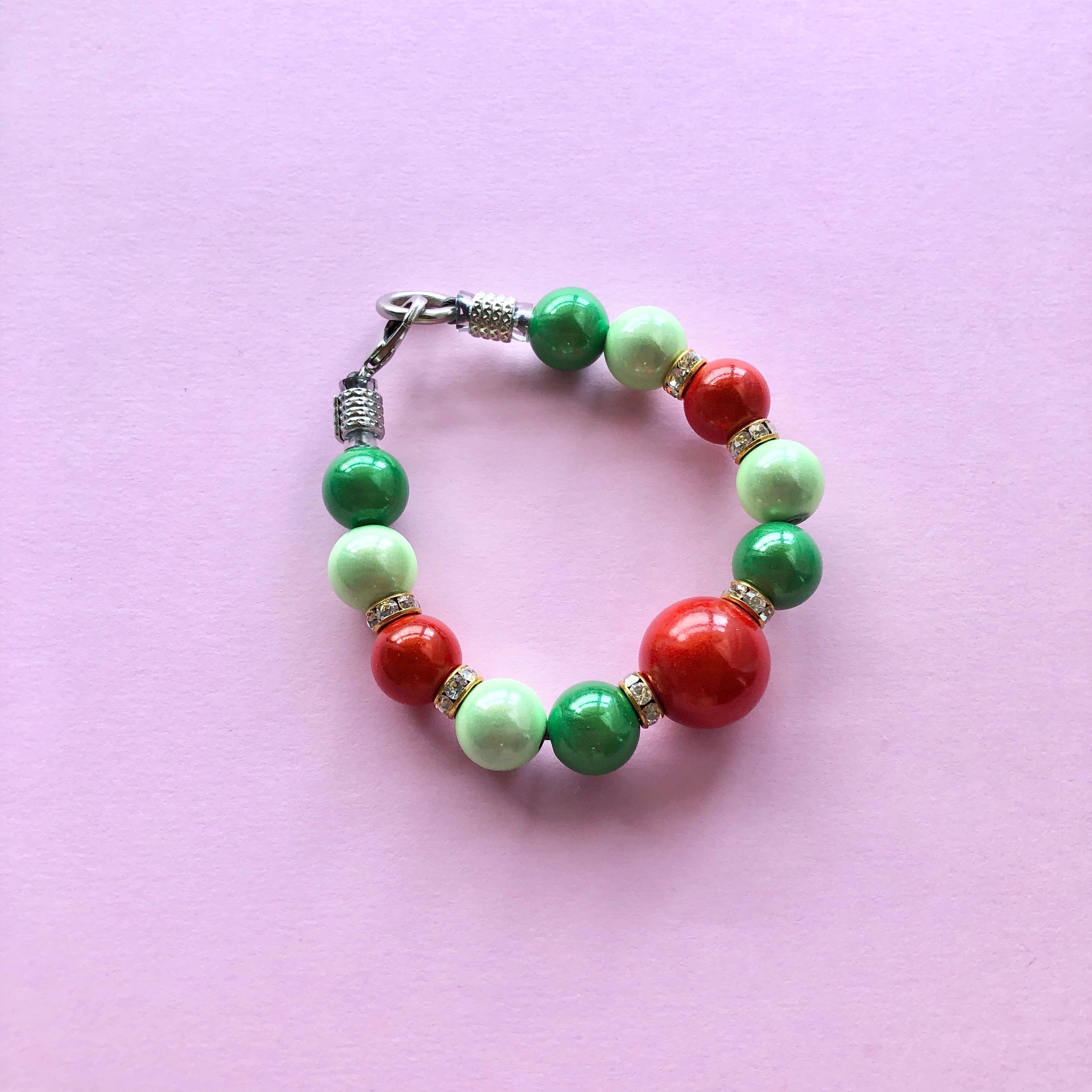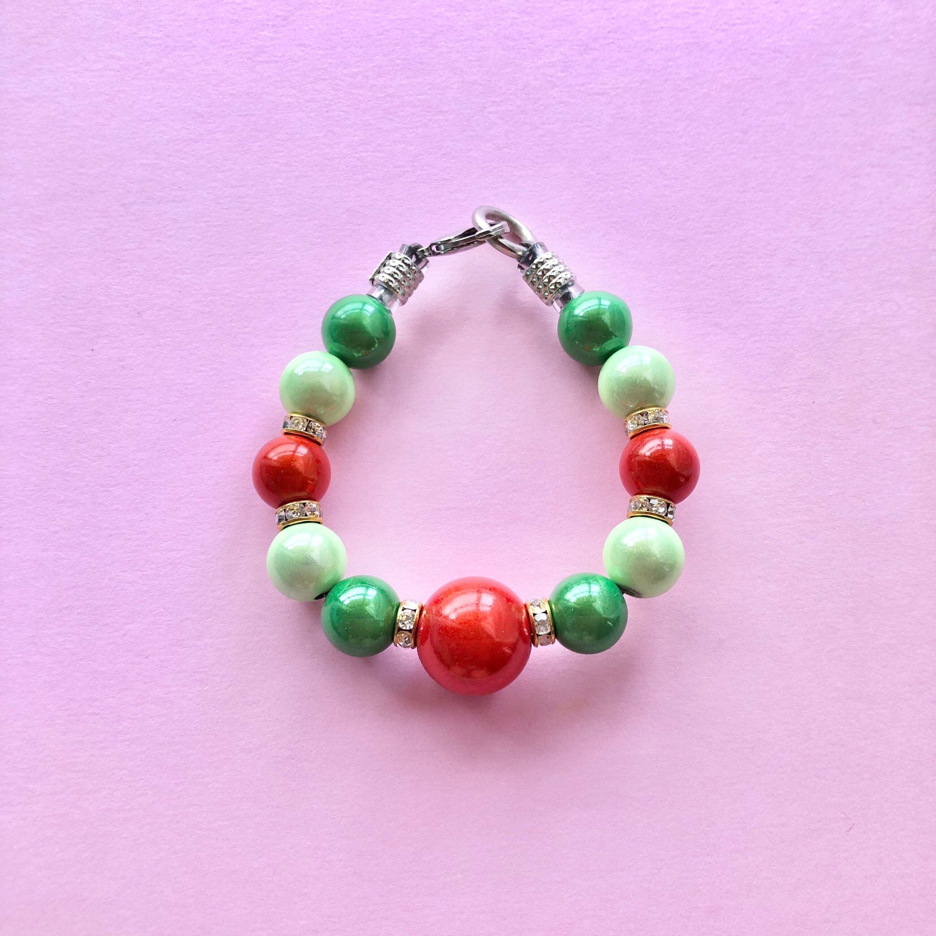 メタリックに輝くビーズが、首元をぐんと華やかに盛り上げてくれます。