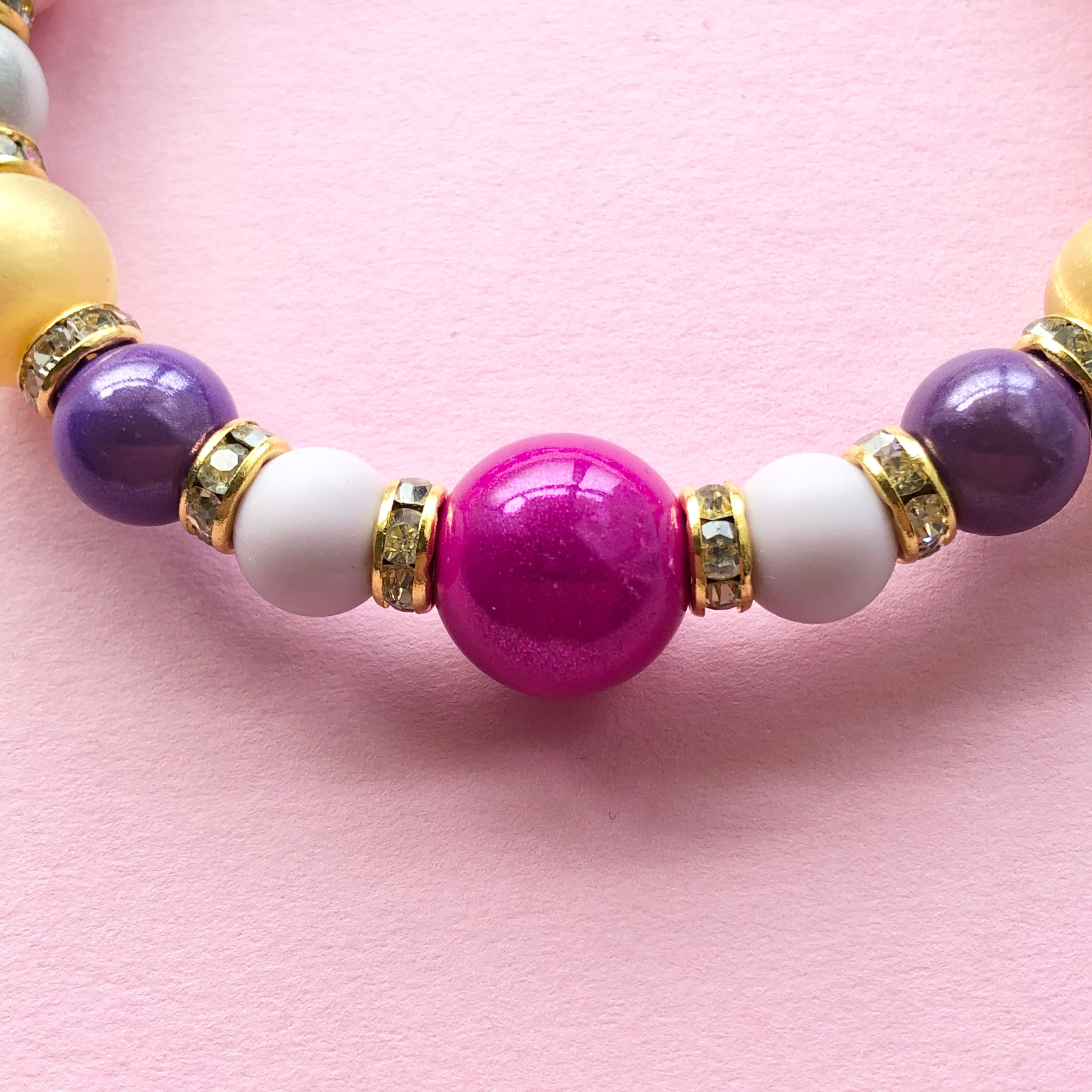 メタリックに輝くビーズとマットな発色のシリコンビーズが、首元をぐんと華やかに盛り上げてくれます。