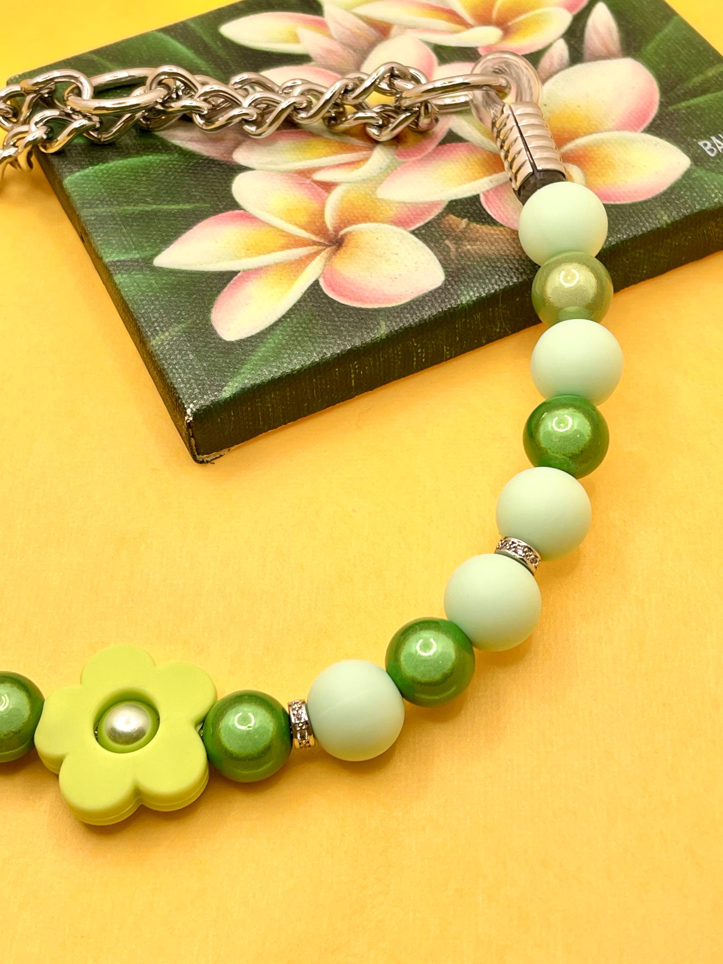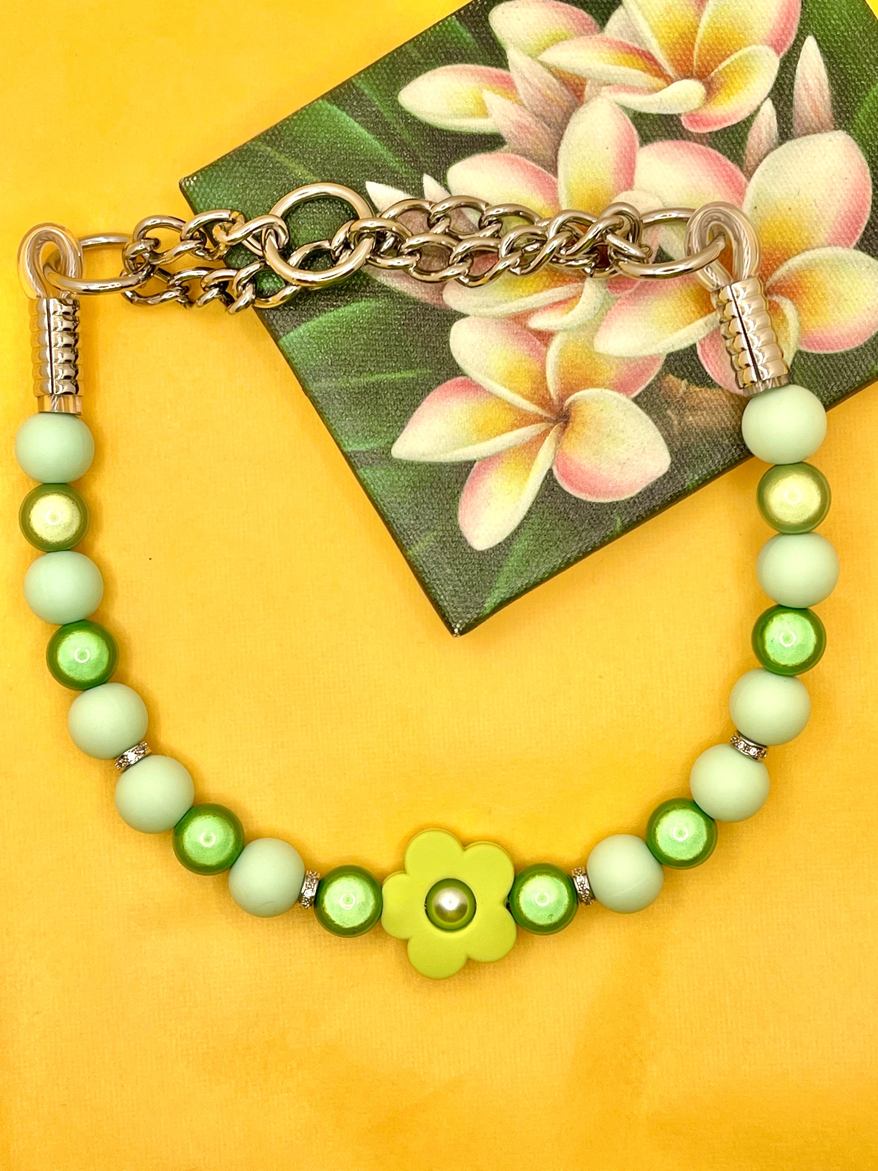 グリーン一色でシンプルかつ品のあるお花マカロンのハーフチョークです。